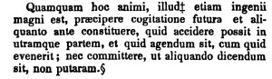 Cicero yukarıdaki paragrafta şöyle diyor: “Bunlar [zor durumlardan sarsılmadan / alnının akıyla çıkabilmek, serinkanlılığını korumak vs.] [yetkin] bir ruhun niteliğidir, buna karşın düşünce yoluyla geleceği önceden kestirmek; olayların hangi yöne gideceğini ve hangi durumda ne olması gerektiğini önceden belirleyebilmek ve sonunda asla ‘düşünmemiştim’ lafına mecbur kalmamak yetkin bir zihnin becerisidir.”