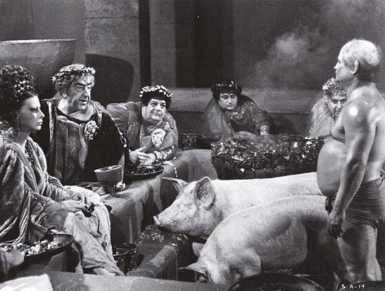 Yine tepsinin üzerine konan, başındaki saçlara iki hurma dalı bağlanmış şapkalı büyük yaban domuzu, altında memelerini emen yavrularıyla birlikte sofraya getirilir, herkesin gözü önünde karnı yarılır ve içinden bir sürü ardıç kuşu havalanır, salonun içinde oradan oraya uçan bu kuşların her biri yine yenmek için yakalanır. Peki, domuzun neden başında saç vardı? Encolpius yemeğe katılmış konuklardan biri olarak bu soruyu bu sofranın müdavimlerinden birine sorar, meğerse domuz azat edilmiş köle kılığında sofraya getirilmiş, Encolpius bu türden zengin sofralarının yabancısı olduğu anlaşılmasın diye başka soru sormaz. Güzel bir köle oğlan getirilir içeri, kendisinin –aynı zamanda şarap tanrısı Dionysius’un adları olan- Bromium, Evium ve Lieum olduğunu söyler. Trimalchio da onu azat ettiğini söyleyerek konuklarına döner ve şarap tanrısını bile azat ettiğini söyleyerek konukları güldürür (40). Trimalchio’nun sofrasında yemek ile kaba güldürü öğelerinin birlikte sunulması Trimalchio kadar onun konuklarının yani eşlikçilerinin de kötücüllüğüne işaret eder.
