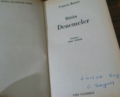 Tekrar belirteyim ki, bunun gibi çok tuhaflık gördüm Akşit Göktürk’ün çevirisinde. En naifini -en zararsızını?- aldım, içinizden bir kısım kişiler “ne var ki? olur o kadar” diyebilsin istedim, haddimi fazla aşmayayım istedim! Hem bu arada Bacon’ın Denemeler‘ini de tanıtmış / hatırlatmış oluyorum, fena mı?