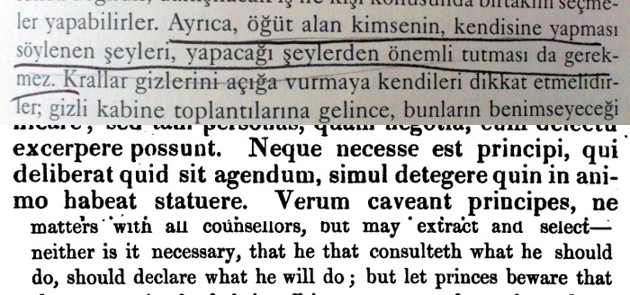 Şöyle diyor Bacon: “neither is it necessary, that he that consulteth what he should do, should declare what he will do…” Yani “ne yapması gerektiğiyle ilgili [birisine] danışan bir kimsenin, ne yapacağını açıklamasına gerek yoktur.” -İlgili ifadede doğrudan geçmese de- Bağlam krallarla ilgili olduğundan, buradaki “bir kimsenin” kral olduğunu biliyoruz, aynı cümlenin Latincesi ise “kral” öznesini vurgulayarak verdiğinden anlam daha açık: