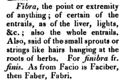 Oysa Latincesinde “laxis… fibris” deniyor, laxus sıfatı “gevşek” anlamında olmakla birlikte burada fibra ismine uyuyor, o halde fibra‘yı incelersek, olayı çözeriz. Fibra Latincede ilkin “bir bitkide ya da bir hayvanda iç kısım, lif” anlamındadır, örneğin bkz. Cicero, De Senectute 15.51: “viriditas herbescens, nixa fibris stirpium, sensim adolescit.” Buradan hareketle, özellikle de Augustus sonrasında [içte olmalarından dolayı] “bağırsaklar” anlamı da kazanmıştır. Daha sonra Plinius’un da kullandığı gibi, (33. pr.1: persequimur omnes ejus terrae fibras) yaşadığımız dünyanın / yeryüzünün “iç kısmı” anlamına da kavuşmuştur.