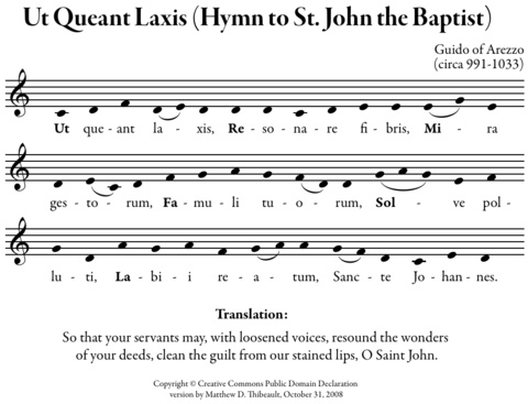 Buna göre, baştaki ut do (C) notasına denk geliyor, dolayısıyla do, re, mi burada ut, re, mi oluyor. Müzik tarihindeki klasik nota isimlendirmesini (ilk altı notayı) 11.yy.’da yaşamış olan Benedict rahibi, Arezzolu Guido (ya da Guy Aretin: Bu mümtaz şahsiyet yeni ve farklı müzik öğrenme yöntemleri üzerinde çalışmaya adamış kendisini, sonunda “Micrologus” başlığını taşıyan bir kitap yazmış ve dönemin Papası 8. Benedict tarafından defalarca Roma’ya davet edilmiş) bu ilahideki ilk hecelere göre yapmış, yedinci nota yani si ise 18. yy.’da Sancte Iohannes ifadesinin baş harflerinden esinlenerek ilk altı notaya eklenmiştir.