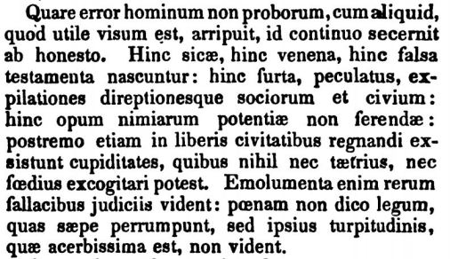 “Anlaşılıyor ki, yararlı görünen bir şeyi her daim ahlaken doğru olandan ayırmak erdemsiz insanların hatasıdır. Buradan doğar hançerler, zehirler, yalan tanıklıklar, hortumculuk, soygunlar, müttefiklerin ve vatandaşların yağması; buradan çıkar aşırı zenginlik, yayılmaması gereken güç, bunun sonucunda meydana gelir özgür vatandaşları yönetme arzuları, ki bunlardan daha rezil ve kepaze olan hiçbir şey düşünülemez. Erdemsiz kişiler aldatıcı yargılarından ötürü bu gibi şeylerden edinecekleri kazançları görür de, çekecekleri cezayı göremez, çoğun kaçabildikleri yasa cezasını kast etmiyorum, cezaların en ağırı olan kendi ahlakî çöküntülerini göremezler.”