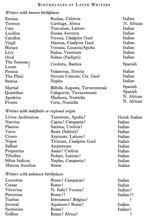 Yazar çalışmanın sonuna Latin yazarlarının doğum yerleri ve kökenleriyle ilgili bir tablo koymuş, onu da paylaşayım: