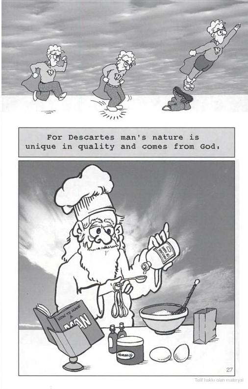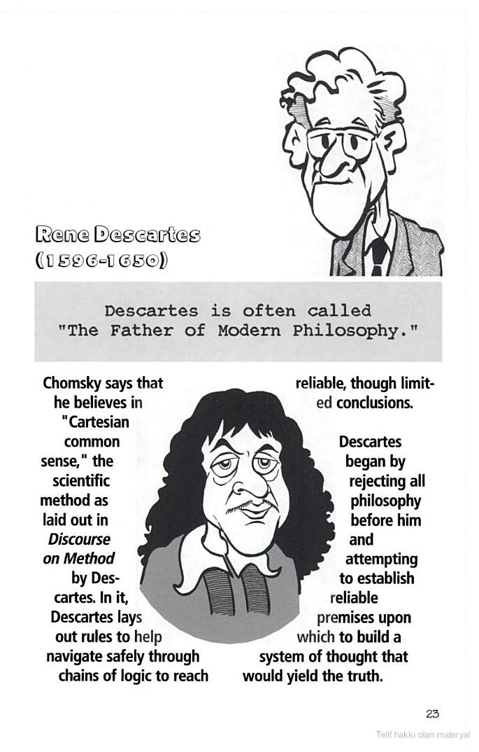 David Cogswell’in kaleme aldığı, çizimlerini Paul Gordon’un yaptığı “Chomsky For Beginners” başlıklı eserden aldım, Descartes’a yeni başlayanlar için de yeni bir başlangıç olabilir sanıyorum: