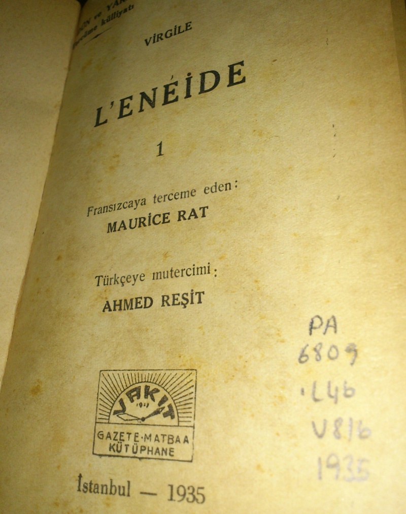 Batıyı tanıma faaliyetlerinden biri olarak Latin edebiyatının güneşi olan Vergilius’un (“noster Vergilius” der çoğu Latin yazar, “Vergilius’umuz”) Aeneis’i de çevrilmek istenmiş 1930’larda. Bu meşakatli görev için elbette Latince bilmek şarttır diye düşünebilirsiniz, öyle ya Vergilius Latince yazmıştı. Ancak taze cumhuriyetin -en azından ikinci dünya savaşı sonrasına kadar- henüz Latince bilen, yetkin bir kadrosu yoktu. (Cumhuriyet Avrupa’da savaştan ya da faşizmden kaçan kimi alimlere kucak açınca, üniversitelerimizdeki bölümler de, -tüm kara parçalarında, klasik filoloji dahil- belki de daha sonra hiç olmadığı kadar evrensel ölçüde tanınan isimlerle dolmuş oldu. Onlardan sonraki üniversitelerimizin hali ise, ilgililerin takdiridir herhalde.) Ahmed Reşit beyefendi, birçok çağdaşının yaptığı gibi ikinci bir dil üzerinden bir klasik metni Türkçeleştirebileceğini düşünmüş olmalı ki, Aeneis’i çevirme işini üstlenmiş. Çeviri 1935’de Vakit Gazete Matbaa Kütüphane (yayınevi) tarafından basılmış: