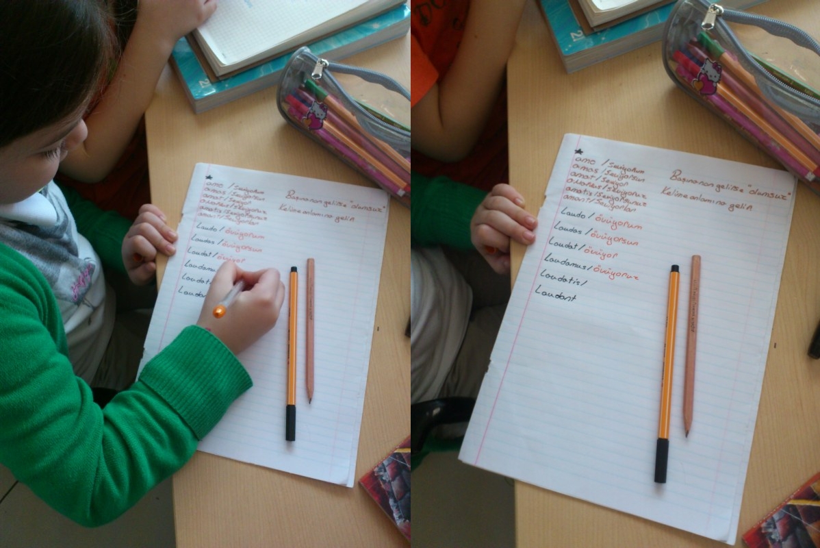 Doğa’daki (Acarkent) ikinci sınıflarda Latince fiil çekimini öğretirken bir öğrencimin (Ece) güzel yazısı dikkatimi çekti, hemen fotoğrafını çektim. Sonra fotoğrafa bakarken gördüm, kağıdın köşesine “Başına non gelirse ‘olumsuz’ kelime anlamına gelir.” yazmış, ilginç non‘un üzerinde henüz çok durmamıştım, bir kere “olumsuz yapar” demiştim. Güzel yazısı kadar, not alışı ve üslubu da çok hoşuma gitti.