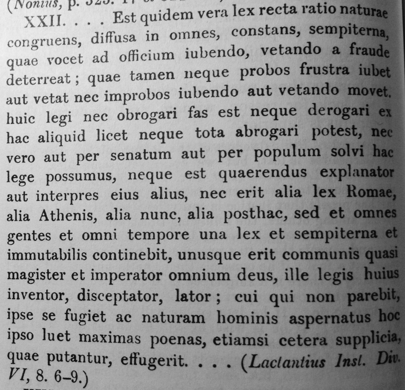Hakikî yasa doğaya uygun olan doğru akıldır, her şeye nüfuz eder, tutarlıdır, daimîdir ve buyurarak yükümlülüğe çağırır, yasaklayarak yanlıştan döndürür. Bununla birlikte ahlaklı insanlara boş yere buyurmaz ve yasak koymaz, ahlaksız insanlara buyurup yasak koyarak yönetir. Bu yasayı değiştirmek günahtır, bu yasanın bir parçası bile değiştirilemez, tümü yürürlükten kaldırılamaz; kuşkusuz ne senatus, ne de halk aracılığıyla bu yasadan kurtulabiliriz, onun için başka bir açıklayıcı ya da yorumlayıcı aranmamalı; başka bir Roma ya da Atina yasası olmayacak, ne şimdi ne de sonra başka bir yasa olacak, aksine her dönem her soyu daimî ve değişmez olan tek bir yasa kuşatacak, herkesin adeta tek bir öğretmen ve efendi niteliğindeki bir tanrısı olacak, o bu yasanın kurucusu, hakemi ve taşıyıcısıdır; bu yasaya göre hareket etmeyen aslında kendisinden kaçmış olacaktır ya da insan doğasını küçümsediği için, düşünülen diğer eziyetlerden kaçabilse de, en büyük cezaları çekecektir.