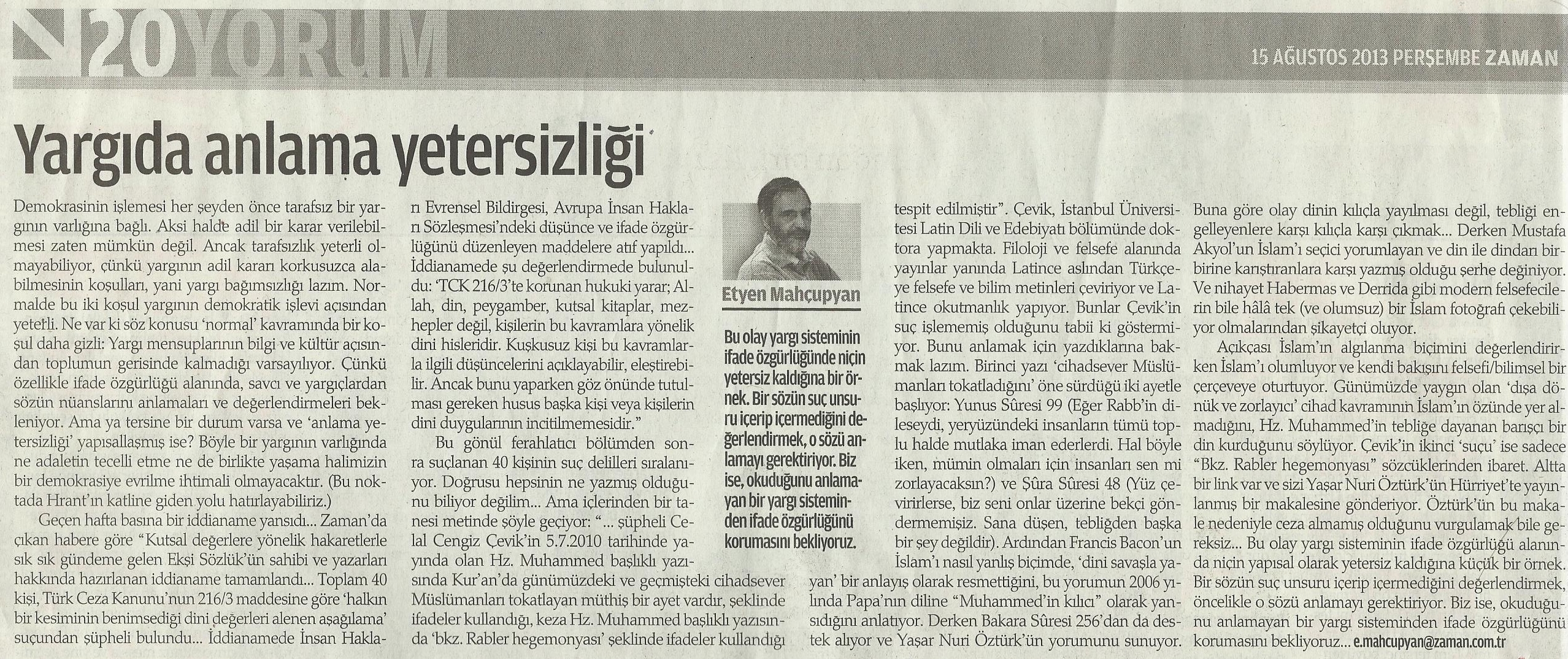 Etyen Mahçupyan ekşi davasındaki yazımla ilgili olarak bugünkü (15.8.2013) Zaman gazetesinde “Yargıda anlama yetersizliği” başlıklı bir yazı klaleme almış.