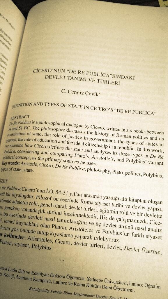 Bu sayıda “Cicero’nun ‘De Re Publica’sındaki Devlet Tanımı ve Türleri” başlıklı bir makalem bulunuyor (s.319-354). Makalede Cicero’nun adı geçen eserin birinci kitabında yaptığı devlet tanımı ve sıraladığı devlet türlerini, eserde geçtiği gibi toplum anlayışıyla birlikte incelemeye çalıştım.