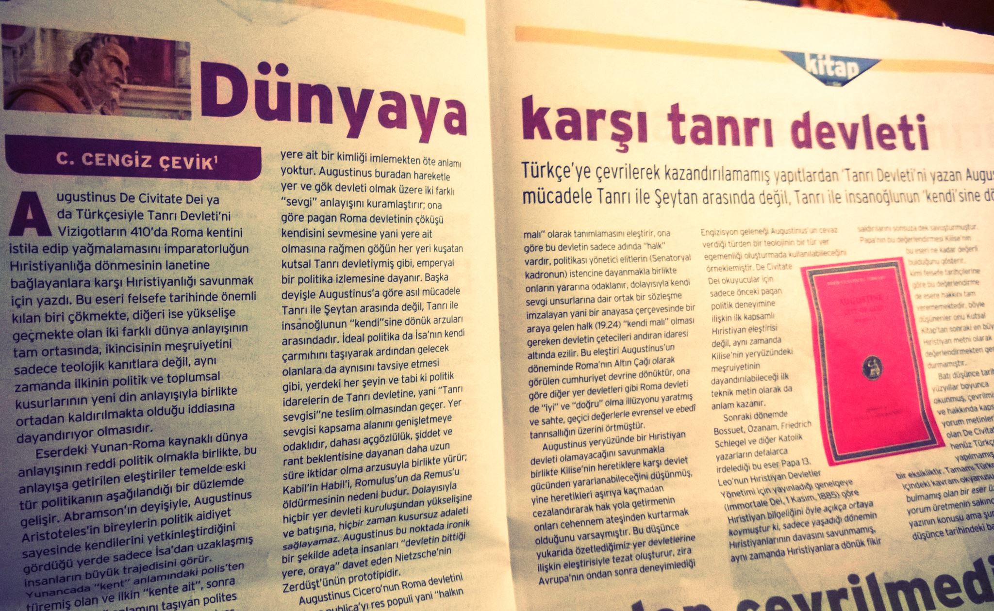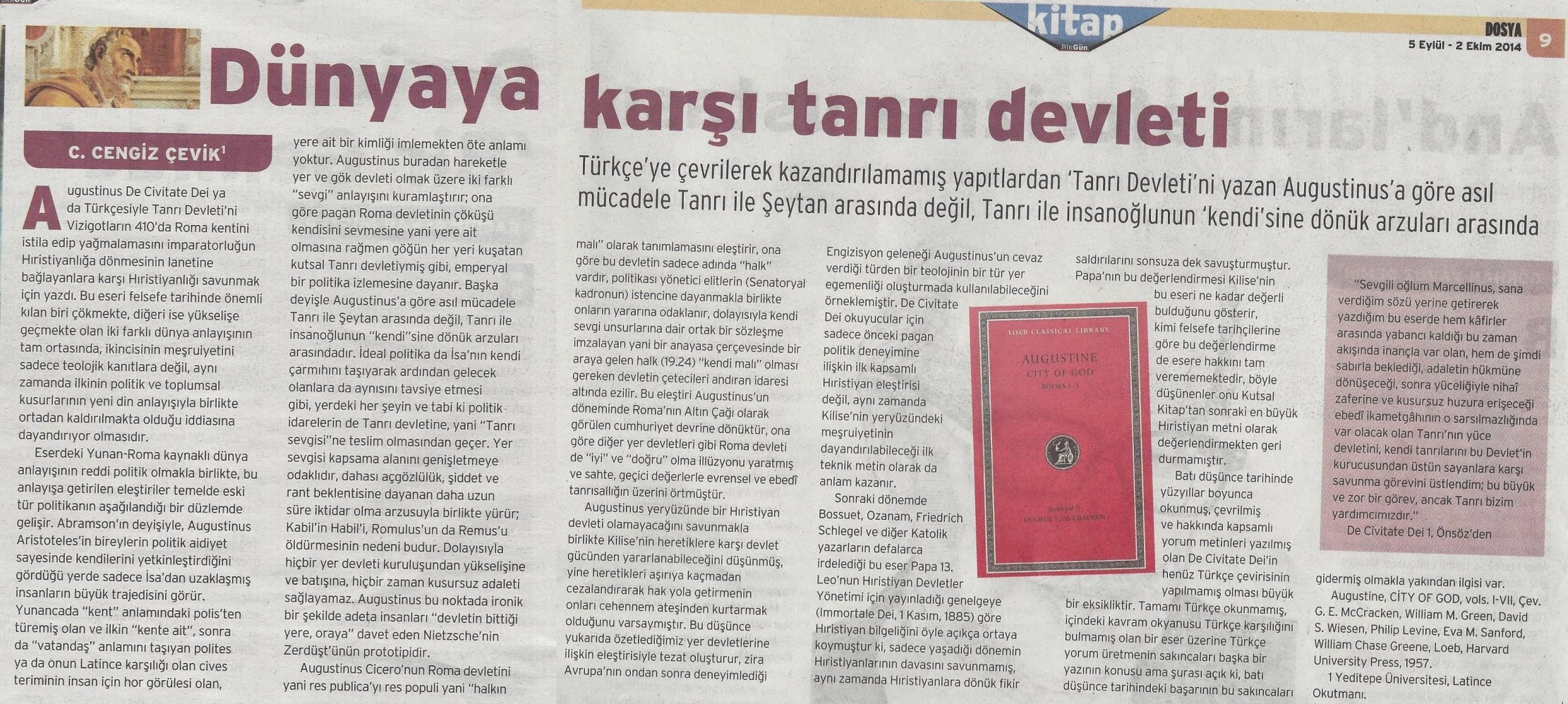 Birgün gazetesinin kitap ekinin (Birgün Kitap) son sayısında (s.152, 5 Eylül – 2 Ekim 2014) Augustinus’un De Civitate Dei adlı eserini anlattığım “Dünyaya karşı tanrı devleti” başlıklı yazımı okuyabilirsiniz. Aşağıdaki resme tıklayarak da sayfaya ulaşabilirsiniz: