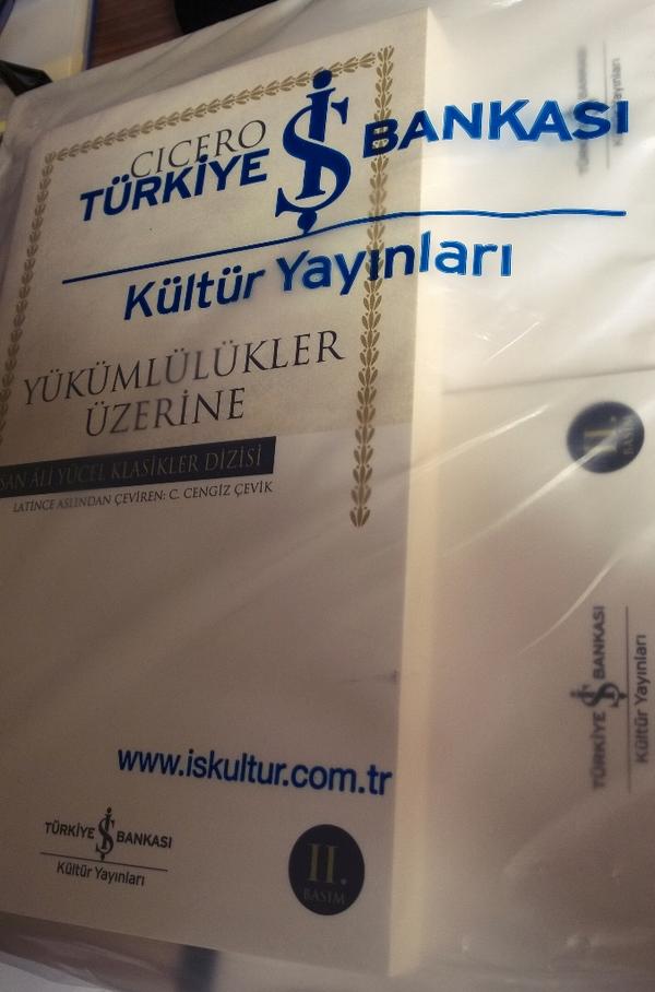 Yükümlülükler Üzerine‘nin (De Officiis) ikinci baskısının yapıldığı haberini bana gönderilen kitaplar yoluyla öğrendim. Geçen sene çıkmış olan bu kitabın ikinci baskıyı görmüş olması beni şaşırttı. Daha önce ilk defa Seçme Aforizmalar‘ın ikinci baskısı olmuştu, ondan ve bundan önce Göksel Kürelerin Devinimleri Üzerine‘nin ikinci baskısını bekliyordum, yalan yok. Bununla birlikte geri dönüşlerden Yükümlülükler Üzerine‘ye ilgi olduğunu da görmüyor değildim, günümüzün siyaset ve toplum iklimine uygun bir eser olması da bunda önemli bir etken olmalı.