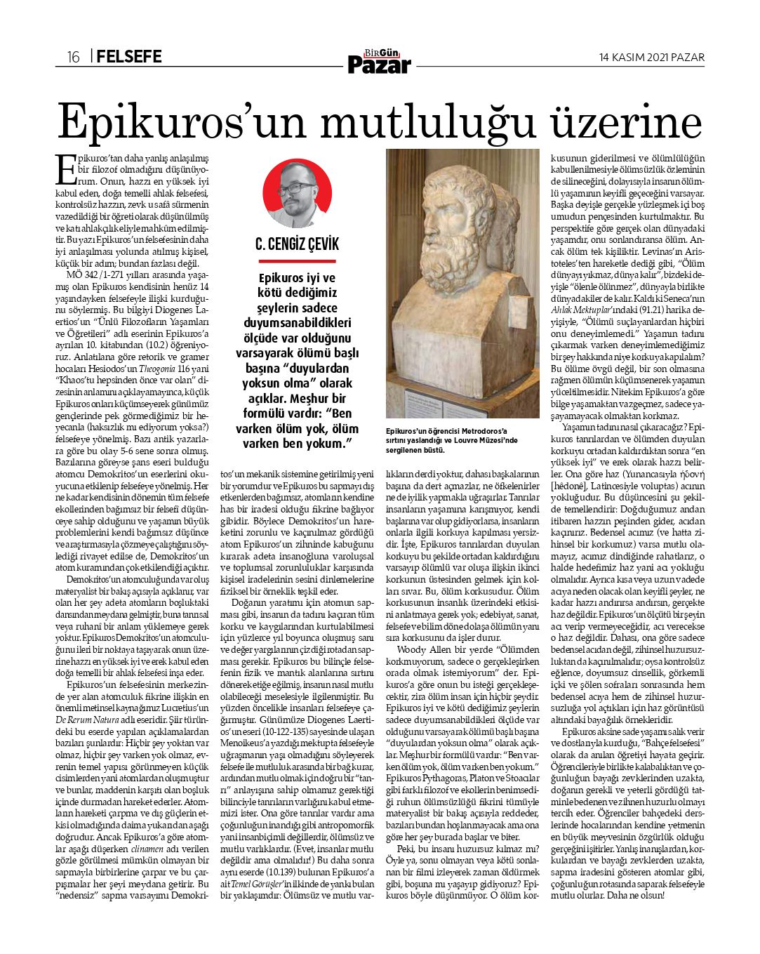 “Epikuros’un Mutluluğu Üzerine”, Birgün Pazar, s.766 (14 Kasım 2021): 16