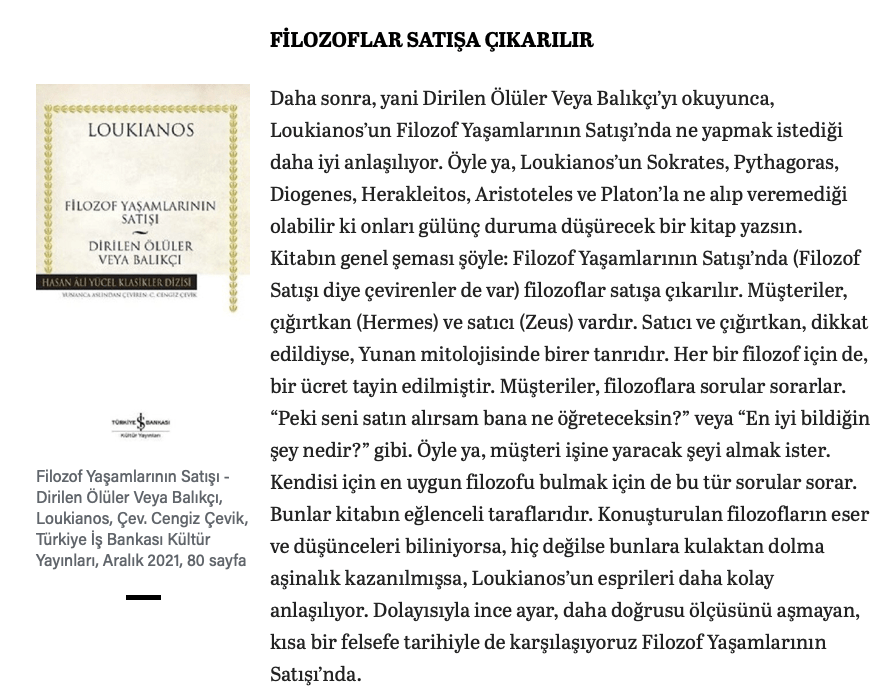 “Dirilen Ölüler Veya Balıkçı’yı okuyunca, Loukianos’un Filozof Yaşamlarının Satışı’nda ne yapmak istediği daha iyi anlaşılıyor. Filozof Yaşamlarının Satışı anlaşılmamış, dolayısıyla aşırı tepkilere, sataşmalara hatta iftiralara uğramış olmalı ki Loukianos Dirilen Ölüler Veya Balıkçı’yı yazma gereği duymuş. Tabii ki çağdaşları Loukianos’un filozofları değil, kendilerini eleştirdiğini biliyorlardı.”