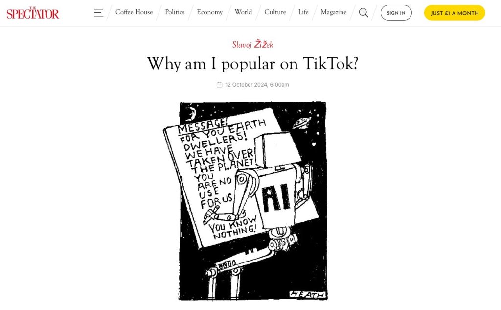 The Spectator‘da Zizek’in farklı konulardaki görüşlerini paylaştığı, “Why am I popular on TikTok?” başlıklı yeni bir yazısı yayınlandı. (Link: https://spectator.co.uk/article/why-am-i-popular-on-tiktok/) Deepl’ye çevirttim ve ufak tefek düzeltmeler yaptım. Yazı şudur: