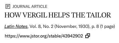 Yukarıdaki Vergilius’un sözüyle ilgili Jstor’da gezinirken “Latin Notes, Vol. 8, No. 2 (November, 1930), p. 8″ künyeli, “HOW VERGIL HELPS THE TAILOR” (Vergilius Terziye Nasıl Yardım Eder) başlıklı bir yazı gördüm. (Link)